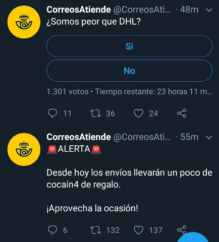 Entre los tuits enviados por los hackers estaban algunos como: «Desde hoy los envíos llevarán un poco de cocaína de regalo» o encuestas que preguntan si son «peor que DHL», «ALERTA, desde hoy los envíos llevarán un poco de cocain4 de regalo, ¡aprovecha la ocasión!».