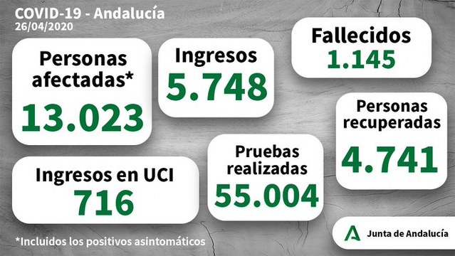 13.023 son las personas con contagios contadas por las 12.824 de ayer, a ello se le suma un total de 14 fallecimientos en las 8 provincias andaluzas, queda saber el desglose por cada ciudad que será a lo largo de la próxima hora. Otro dato que es positivo es que se han recuperado 446 personas en la comunidad autónoma, reseñable viendo el gran avance de este mes de Abril. De 4.295 personas pasa a 4.741 las recuperadas.