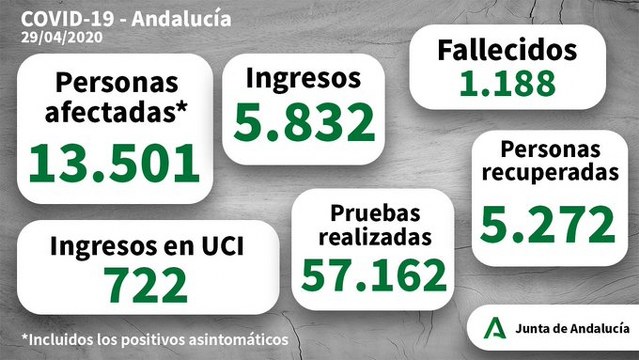 Andalucía pasa de 1.168 personas fallecidas a 1.188, es el dato negativo de la jornada. En media hora facilitaremos el parte de Málaga, provincia de la que es este medio y también los datos de las otras 7 provincias andaluzas a través del parte oficial de la Junta de Andalucía – mediante los datos de Sanidad -.
