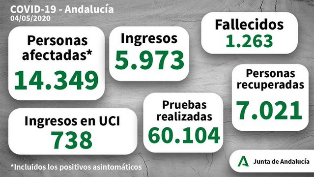 La Junta de Andalucía ha facilitado el parte del domingo 3 al lunes 4 de Mayo con la cifra de nuevos contagios, ingresos, fallecidos, ingresos en la UCI, pruebas realizadas y personas recuperadas. Lo positivo del día es que hubo apenas 62 nuevos contagios de 133 pruebas realizadas por parte de los distintos hospitales, una cifra que se reduce viendo otros días.