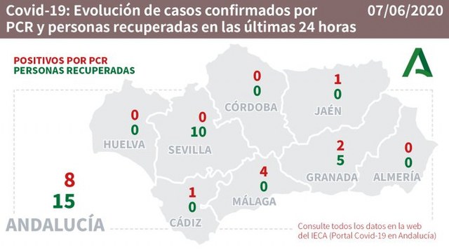 Los datos facilitados por la Junta de Andalucía revela que son 8 los positivos por coronavirus tras los PCR, mientras la recuperación de este domingo ha sido de 15 personas. La nota negativa la ponen los 2 fallecidos, es el número confirmado por parte del SAS en la comunidad y los decesos pertenecen a la ciudad de Sevilla.
