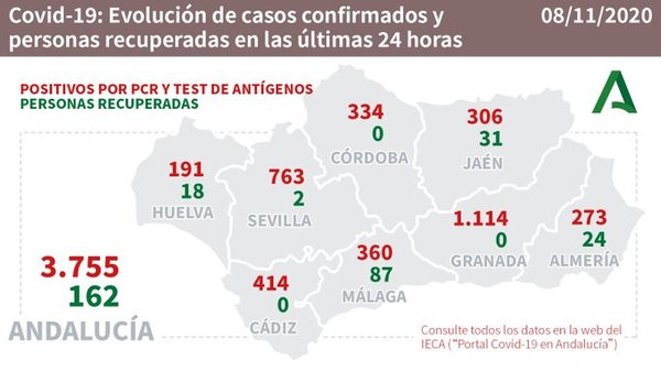 Según los datos de la Consejería de Salud, se ha producido una fuerte bajada de los contagiados y del número de fallecidos, que no ha dejado de subir en los últimos días. Granada, con 1.114, y Sevilla, con 763, encabezan las provincias andaluzas con más contagios en un día; seguidas de Málaga, con 360; Jaén, con 306; Córdoba, con 334; Cádiz, con 414; Almería, con 273 y Huelva, con 191. Córdoba ha sido la provincia con más fallecidos registrados en las últimas horas, con 7, seguida de Jaén, con 1; Málaga, Cádiz y Granada, con 2 cada una, y Almería y Huelva con 3 cada una, mientras que no se ha registrado ninguno en Sevilla.