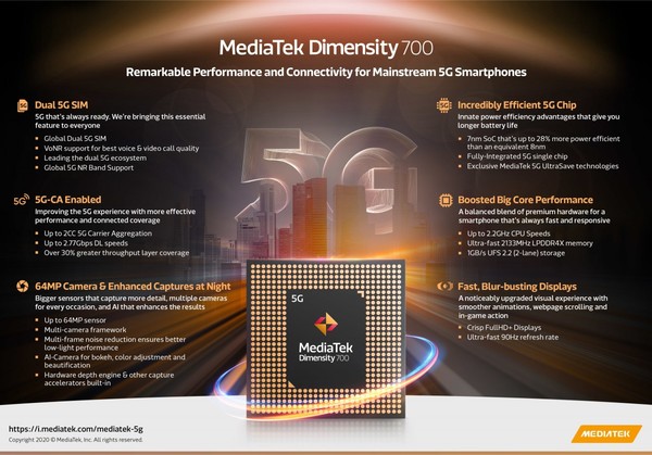 MediaTek continúa su búsqueda para crear teléfonos 5G asequibles; el último paso en esa dirección es el Dimensity 700, un chipset de 7 nm similar al recientemente anunciado Dimensity 720.