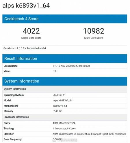 Al menos eso es lo que sugiere la puntuación de un solo núcleo de la lista de Geekbench. El informador también agrega que el núcleo principal de Cortex-A78 tiene una frecuencia de 2.8GHz, pero eso podría cambiar antes del lanzamiento, o podría haber dos versiones separadas. El núcleo más poderoso probablemente alcanzará los 3.0 GHz en lugar de los 2.8 GHz reportados. Los otros tres núcleos Cortex-A78 funcionarán a 2,6 GHz y el grupo de cuatro núcleos Cortex-A55 de bajo consumo funcionará a 2,0 GHz. El Mali-G77 MC9 se encargará de las tareas gráficamente intensivas.