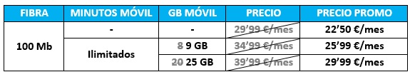 Los suopers pueden elegir entre dos opciones de fibra óptica simétrica, con 100 Mb y 500 Mb de velocidad. Ambas pueden contratarse sin móvil o combinadas con varias opciones de datos en el móvil, siempre con llamadas ilimitadas. En cualquier caso, todas las tarifas tienen un descuento del 25% durante los primeros 12 meses.