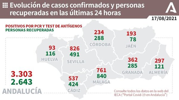 Por provincias: en Almería (89 hospitalizaciones, de las que 25 en UCI), Cádiz (177 hospitalizaciones, de las que 24 en UCI), Córdoba (119 hospitalizaciones, de las que 22 en UCI), Granada (151 hospitalizaciones, de las que 23 en UCI), Huelva (67 hospitalizaciones, de las que 13 en UCI), Jaén (105 hospitalizaciones, de las que 11 en UCI), Málaga (409 hospitalizaciones, de las que 66 en UCI) y Sevilla (280 hospitalizaciones, de las que 47 en UCI).
