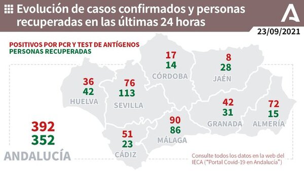 Por provincias: en Almería (40 hospitalizaciones, de las que 17 en UCI), Cádiz (23 hospitalizaciones, de las que 6 en UCI), Córdoba (42 hospitalizaciones, de las que 17 en UCI), Granada (41 hospitalizaciones, de las que 13 en UCI), Huelva (21 hospitalizaciones, de las que 4 en UCI), Jaén (25 hospitalizaciones, de las que 6 en UCI), Málaga (121 hospitalizaciones, de las que 23 en UCI) y Sevilla (107 hospitalizaciones, de las que 30 en UCI).
