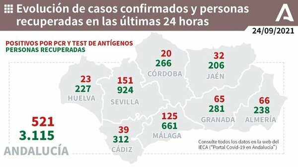 Por provincias: en Almería (38 hospitalizaciones, de las que 16 en UCI), Cádiz (28 hospitalizaciones, de las que 6 en UCI), Córdoba (41 hospitalizaciones, de las que 16 en UCI), Granada (39 hospitalizaciones, de las que 14 en UCI), Huelva (19 hospitalizaciones, de las que 4 en UCI), Jaén (24 hospitalizaciones, de las que 5 en UCI), Málaga (111 hospitalizaciones, de las que 20 en UCI) y Sevilla (99 hospitalizaciones, de las que 29 en UCI).