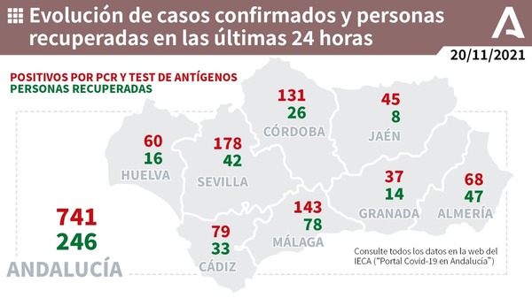 Por provincias: en Almería (15 hospitalizaciones, de las que 6 en UCI), Cádiz (12 hospitalizaciones, de las que 2 en UCI), Córdoba (22 hospitalizaciones, de las que 3 en UCI), Granada (21 hospitalizaciones, de las que 3 en UCI), Huelva (13 hospitalizaciones, de las que 1 en UCI), Jaén (24 hospitalizaciones, de las que 5 en UCI), Málaga (70 hospitalizaciones, de las que 16 en UCI) y Sevilla (29 hospitalizaciones, de las que 4 en UCI).