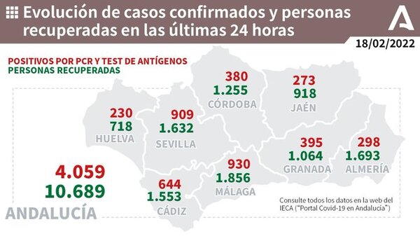 Por provincias: en Almería (86 hospitalizaciones, de las que 8 en UCI), Cádiz (141 hospitalizaciones, de las que 14 en UCI), Córdoba (119 hospitalizaciones, de las que 17 en UCI), Granada (179 hospitalizaciones, de las que 22 en UCI), Huelva (56 hospitalizaciones, de las que 6 en UCI), Jaén (128 hospitalizaciones, de las que 17 en UCI), Málaga (227 hospitalizaciones, de las que 23 en UCI) y Sevilla (205 hospitalizaciones, de las que 31 en UCI).
