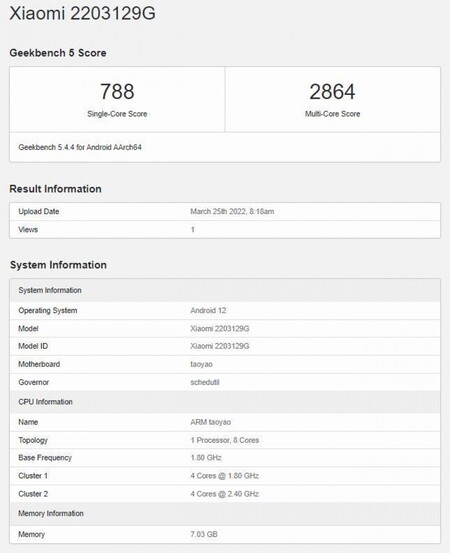 El teléfono con el número de modelo 2203129G apareció en Geekbench, revelando un conjunto de chips Snapdragon 778G y una opción de RAM de 8 GB.