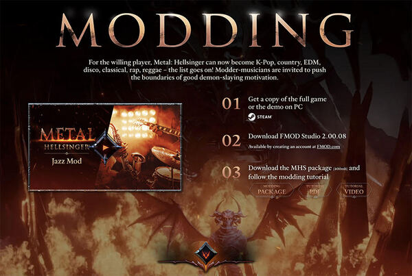 Para aquellos jugadores que lo deseen, Metal: Hellsinger abre sus puertas a estilos como el K-Pop, country, EDM, disco, rap, reggae e incluso a música clásica. La lista es infinita. Se invita a los modders músicos a sobrepasar todos los límites para buscar la mejor motivación y música para liquidar a los temibles demonios.