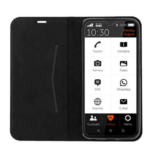 Gracias al alto contraste del menú que cuenta con una fuente grande e iconos claros, el Gigaset GS5 senior no podría ser más fácil de usar, incluso para los principiantes del smartphone. El teléfono tiene una pantalla de inicio personalizable para hasta ocho aplicaciones que se pueden organizar individualmente. La brillante y amplia pantalla con una diagonal de 6,3 pulgadas es muy nítida, cuenta con una resolución full-HD+ y viene equipada con una película protectora. Además, los usuarios reciben una funda abatible de cuero de PU.