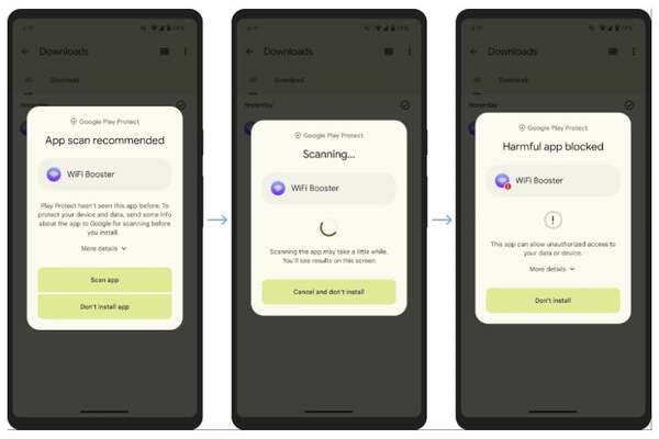 Cuando un usuario intenta instalar una aplicación que nunca antes ha sido escaneada, Google Play Protect recomendará un escaneo en tiempo real. El escaneo extraerá señales importantes de la aplicación y las enviará a la infraestructura backend de Google para su evaluación. Una vez que se completa el escaneo, se notificará al usuario si es seguro instalar la aplicación o si es potencialmente dañina.