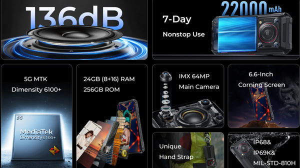 El nuevo smartphone robusto de Oukitel tiene un grosor de 27,2 mm y un peso de 577,5 g. Esto se debe principalmente a su batería de gran capacidad. El WP33 Pro está equipado con una cámara principal de 64MP y una cámara de visión nocturna de 20MP. El volumen máximo del altavoz del smartphone es de 136dB y la potencia es de 5W.