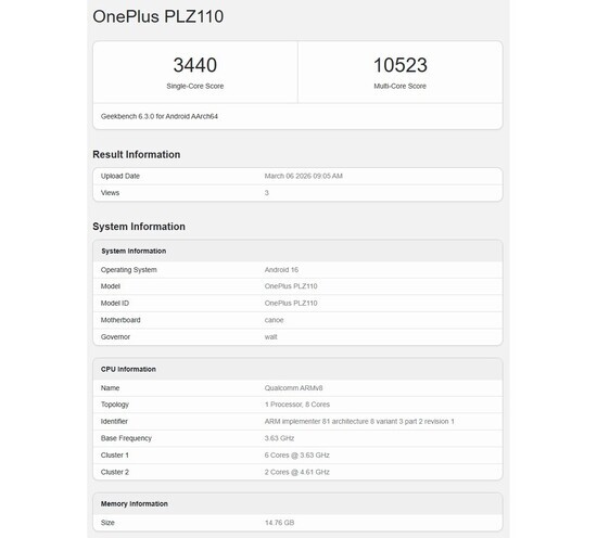 Se ha detectado un prototipo del OnePlus 15T en la base de datos en línea de Geekbench con el número de modelo PLZ110. Obtuvo una puntuación de 3440 en un solo núcleo y 10.523 en múltiples núcleos. Está equipado con el procesador Snapdragon 8 Elite de 5.ª generación, tal como se rumoreaba.